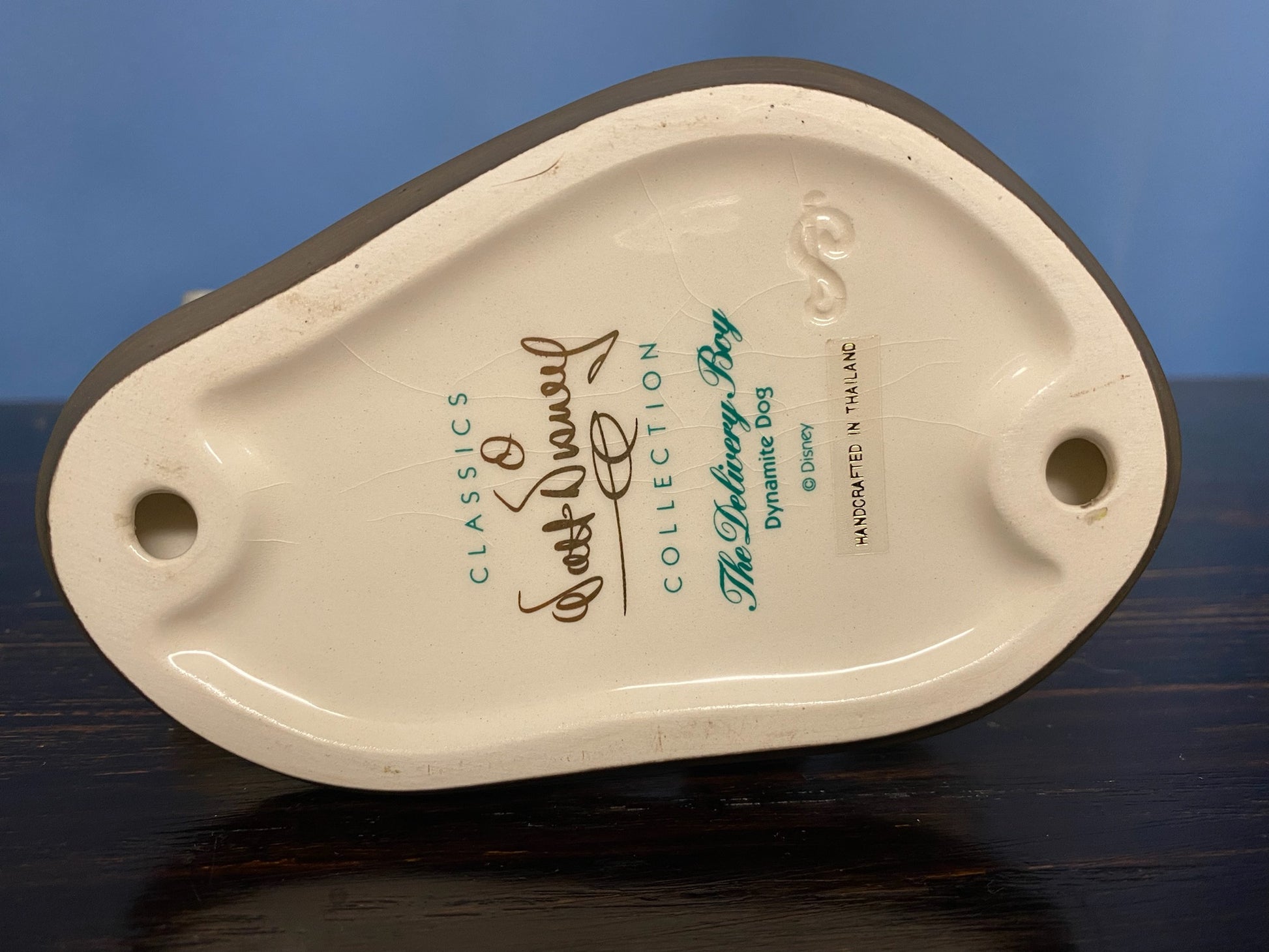 "Dynamite Dog" from Walt Disney's The Delivery Boy. Highly collectible 1993 figurine. Hand sculptured. In original box with Certificate of Authenticity. Sculpture is approximately 4 1/2" high, 6" wide. Sign says "Danger Blasting." Pluto has stick of dynamite in his mouth! Only one available. Free insured shipping in US only. Excellent condition. Original box, shows wear. Items have been inspected before shipping. Free insured shipping in US only.
