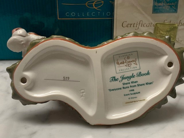 "Everyone Runs From Shere Khan" from Walt Disney's The Jungle Book. Rare vintage 1998 Event Sculpture, #519. Hand sculptured. In original box with sealed Certificate of Authenticity. Sculpture is approximately 8" wide, 4 1/2" high, 3" deep. Only one available. Free insured shipping in US only. No returns on collectibles. Items have been inspected before shipping. Excellent condition.